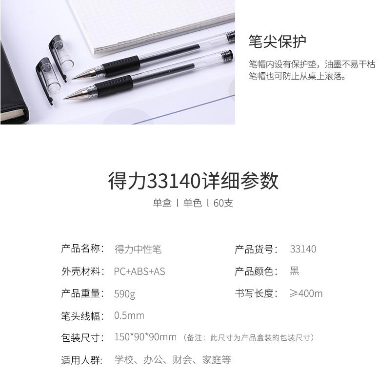 得力文具33140中性筆學生考試量販式黑筆水筆碳素筆0.5mm辦公用品包郵書寫工具60支裝